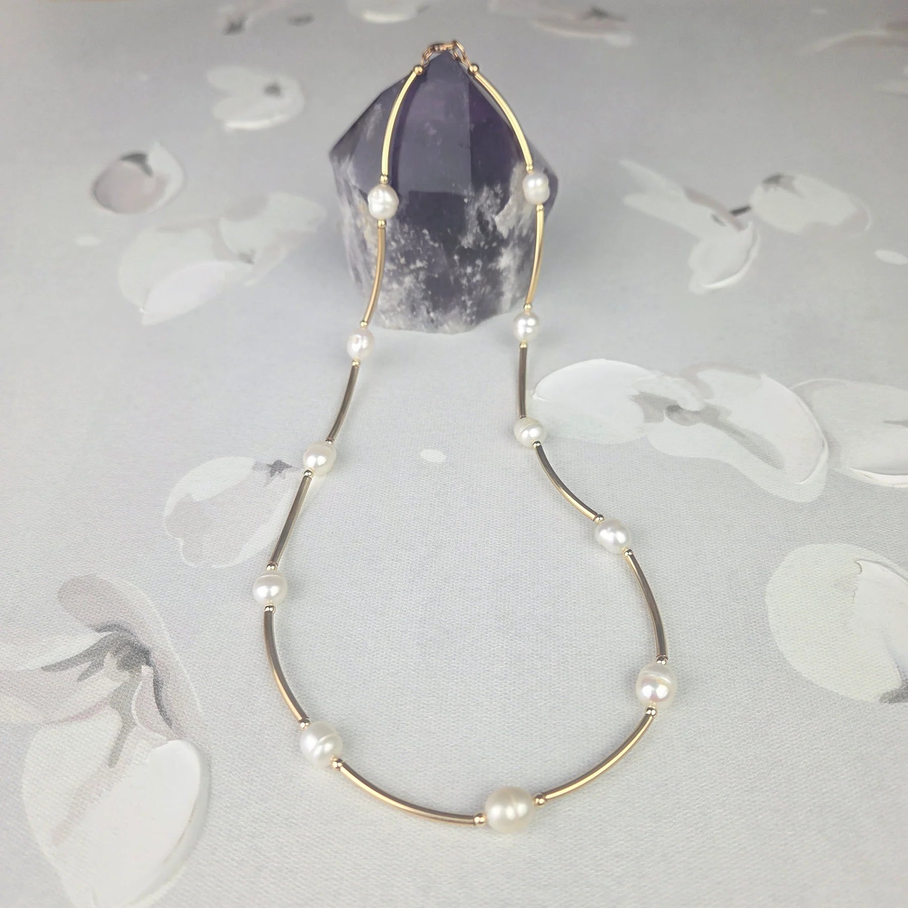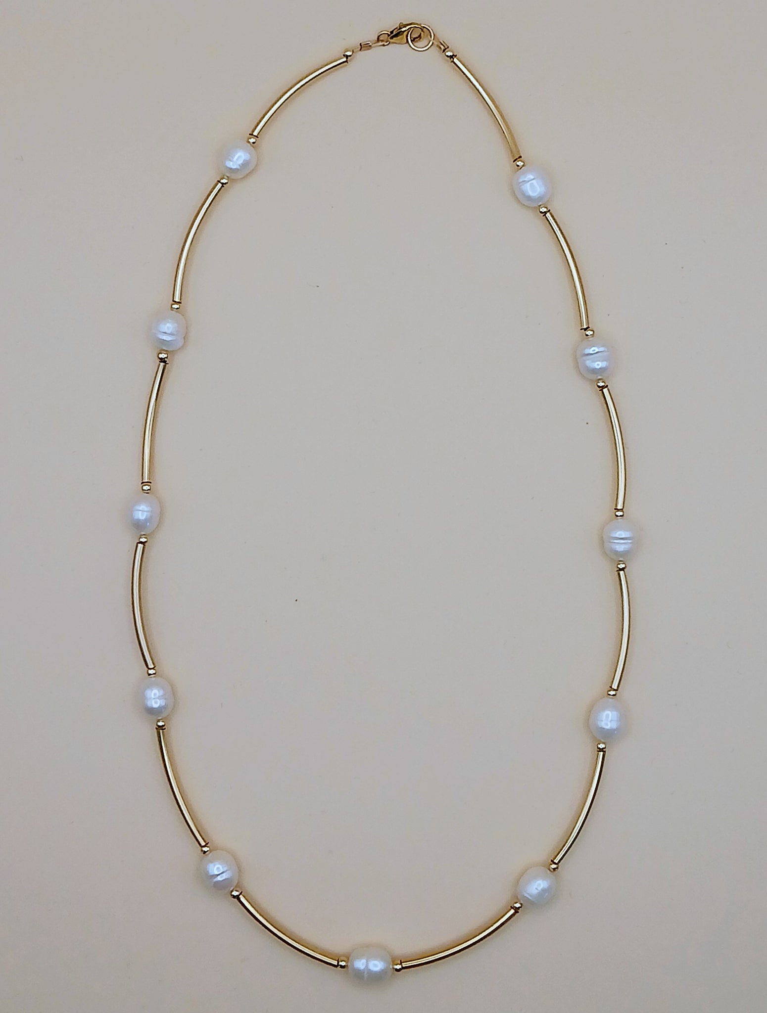 Enhance your style with this elegant necklace, featuring a timeless design made from handcrafted 14K gold-filled curved tubes and radiant freshwater pearls. Each graceful gold arc beautifully frames the pearls, creating a look that is both modern and classic. This necklace is perfect for any occasion, easily transitioning from everyday wear to sophisticated evenings. With its harmonious combination of pearls and gold, this artisan-made piece is a cherished addition to any jewelry collection.