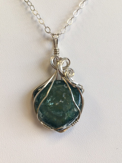 This is a very large piece of indigo tourmaline. It has variations of blue and green and even a slight hint of gold throughout the layers. It has been polished smooth, and is wire wrapped in sterling silver wire. It measures about 1&1/2 inches tall from the top of the bail to the bottom of the stone, and approximately an inch wide. It is also relatively thick. This pendant will come with an 18 inch chain.